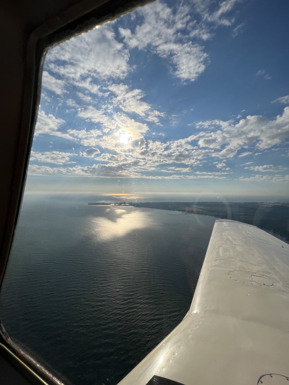 - I worked through my fear of flying in a small plane and flew with my pilot husband to Pelee Island, which requires flying over the waters of Lake Erie. It was stunning, and I meditated a lot on this flight to stay calm. This photo shows us leaving — the sun is rising just beyond the northern tip of the island as we circle around for one last view.