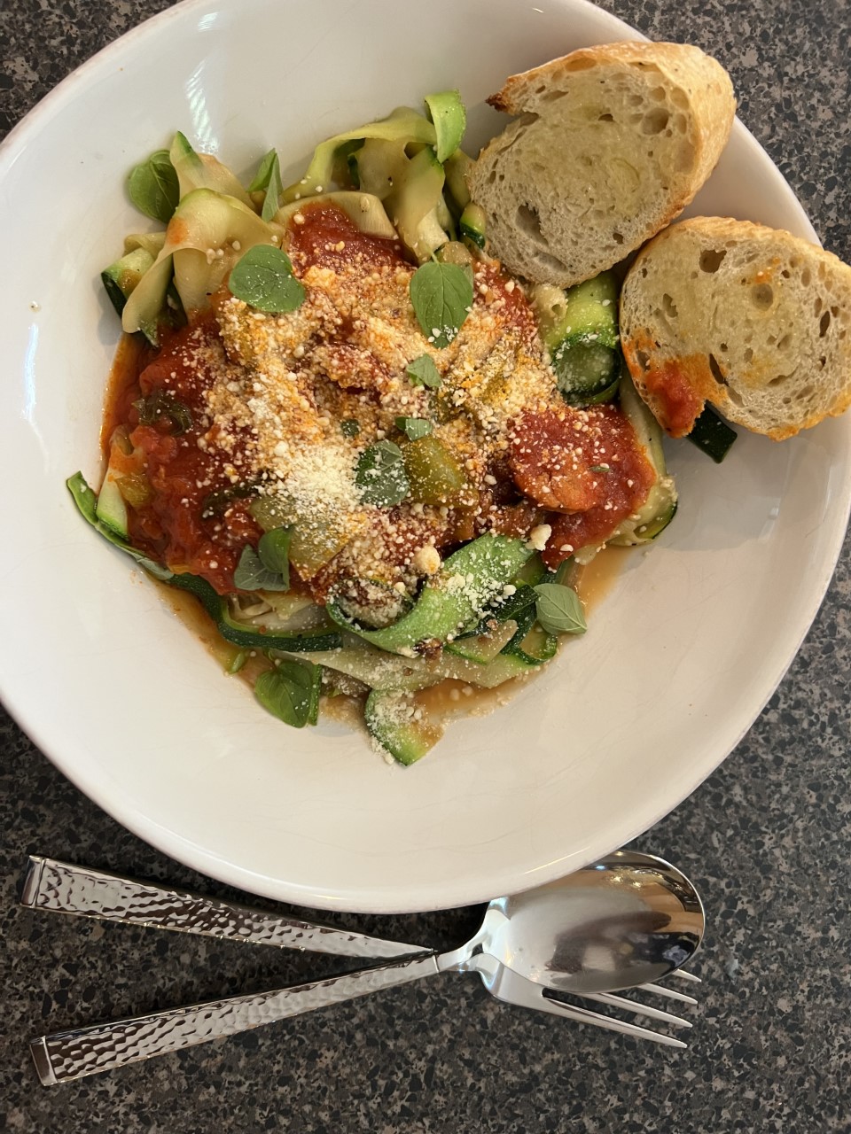 - I made my goal to eat more vegetarian meals and loved making my own zucchini noodles. I just used my vegetable peeler to make zucchini ribbons which I sauteed with a bit of olive oil and garlic and then topped with pasta sauce and parmesan. Yum!